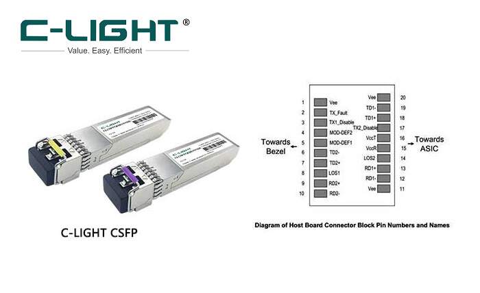 CSFP (compact SFP), as its name suggests, is a more integrated SFP optical module. Comparing to normal SFP, our CSFP is housing in a MSA standard package, but engaging the hardware and software system of two sets of common SFP optical modules designed by using double BOSA.