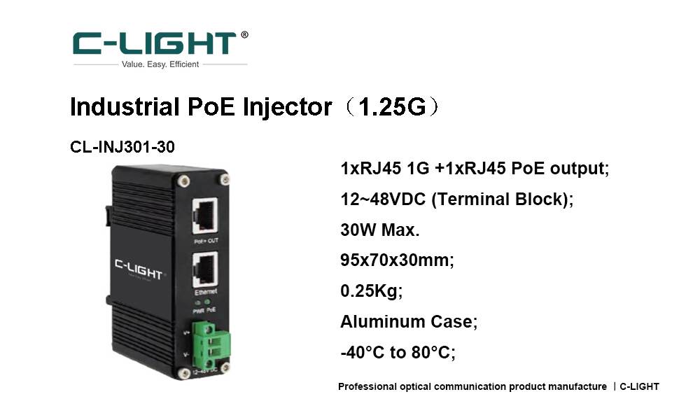 The C-LIGHT CL-INJ301-30 is an industrial single-port PoE injector designed for security cameras, wireless APs, and IoT devices.