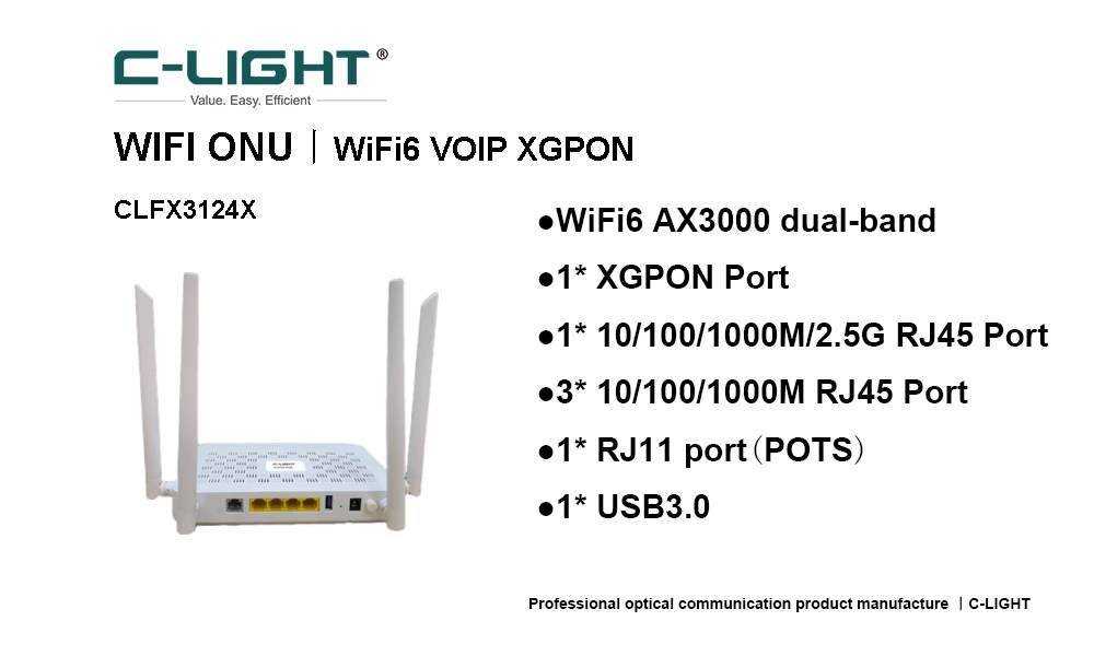 C-LIGHT CLFX3124X is a 3-in-1 smart ONU combining WiFi6, 10G fiber, and VOIP phone for homes and small businesses.