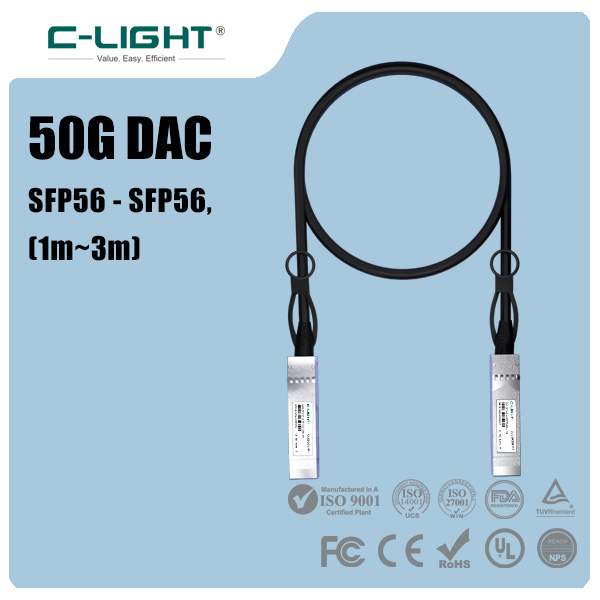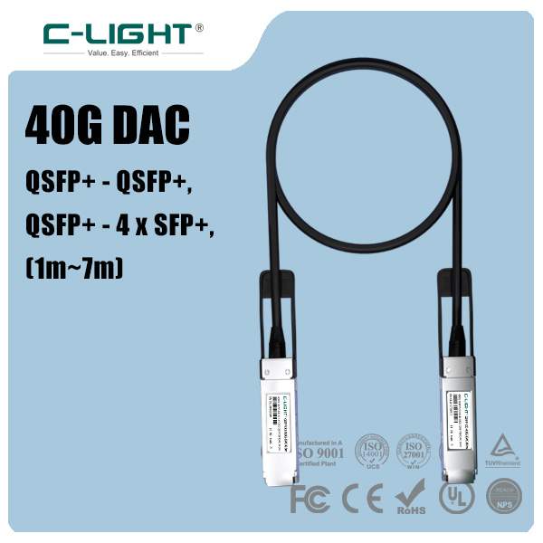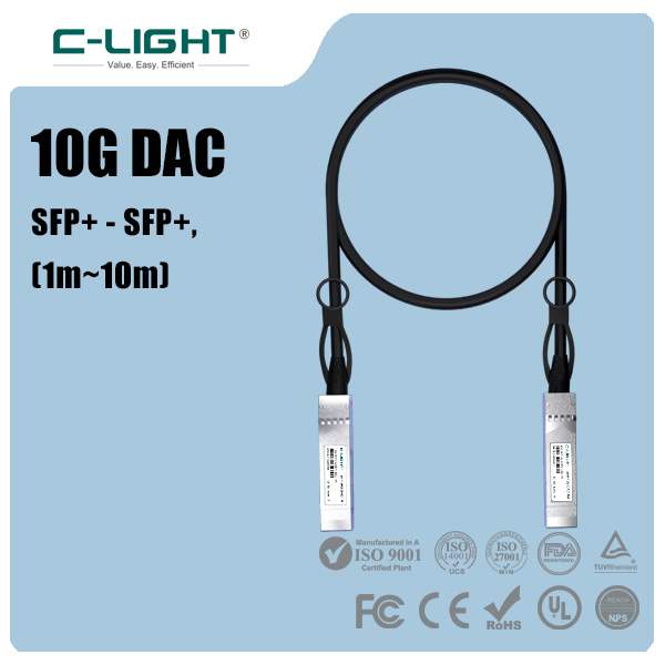 C-LIGHT independently developed 10G DAC high-speed cable, its communication protocol complies with IEEE 802.3ae; interface protocol complies with SFF-8431/8432/8472; packaging protocol complies with SFP+ MSA; transmission distance is 1m, 2m, 3m, 5m,