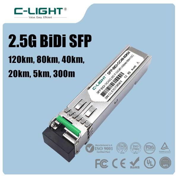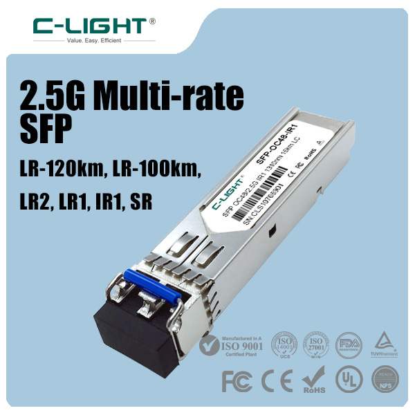 El módulo óptico SFP multivelocidad 2.5G desarrollado independientemente por C-LIGHT soporta una variedad de distancias de transmisión, incluyendo 2km, 15km, 40km, 80km y 120km, y puede proporcionar una velocidad de transmisión de hasta 2,5Gb/s.