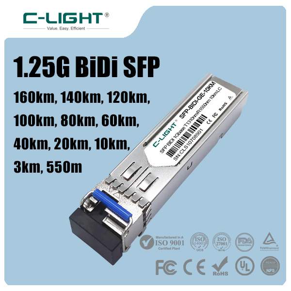 El módulo óptico SFP BIDI 1.25G desarrollado por C-LIGHT soporta una variedad de distancias de transmisión, incluyendo 550m, 3km, 3km, 20km, 40km, 60km, 80km, 100km, 120km, 140km y 160km.